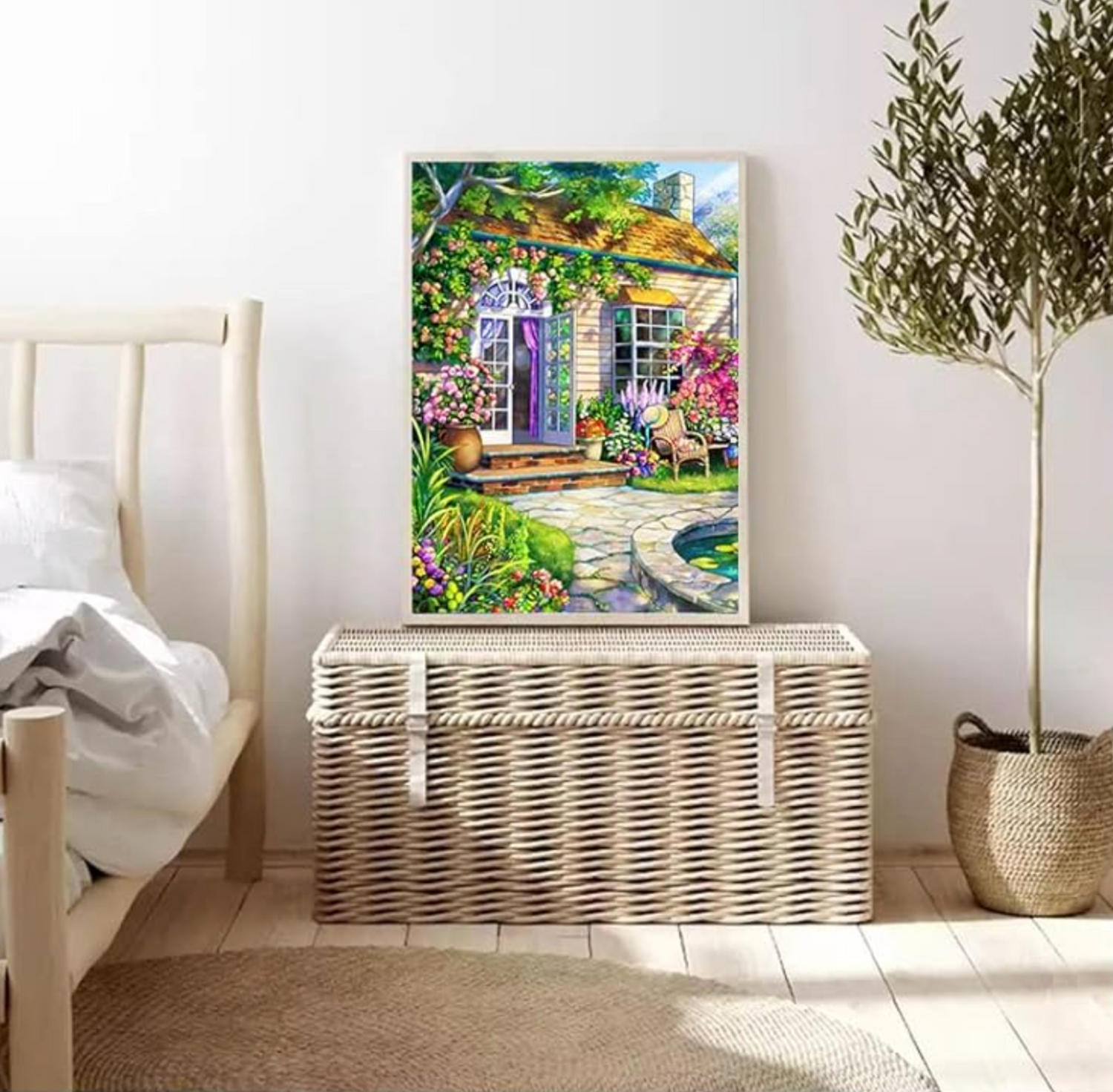 🌸🏡 Een waar bloemenparadijs! Deze kleurrijke afbeelding toont een idyllisch tuinhuisje omringd door weelderige bloemen, een charmant paadje en een vijver vol leven. Zonnestralen dansen op het dak terwijl een open deur uitnodigt tot rust en gezelligheid. Een droom van een tuin in volle bloei – perfect voor een vrolijke en gedetailleerde diamond painting! 🌿✨🪻