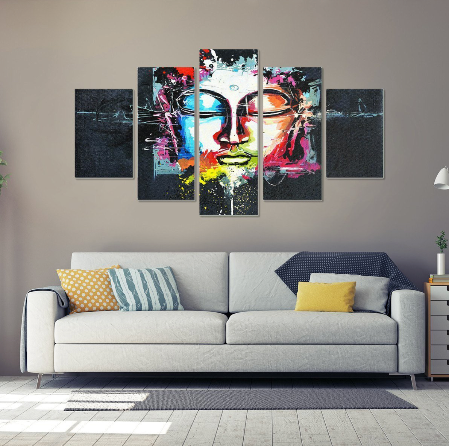 Deze moderne, vijfdelige diamond painting van een Boeddha-gezicht straalt pure sereniteit en balans uit — met een explosie van levendige kleuren op een diepdonkere achtergrond 🖤🌟. De ogen gesloten in diepe meditatie, de contouren zacht en vloeiend, en elke kleurlaag lijkt te dansen op de grens tussen spirituele rust en creatieve expressie 🎭🧘.