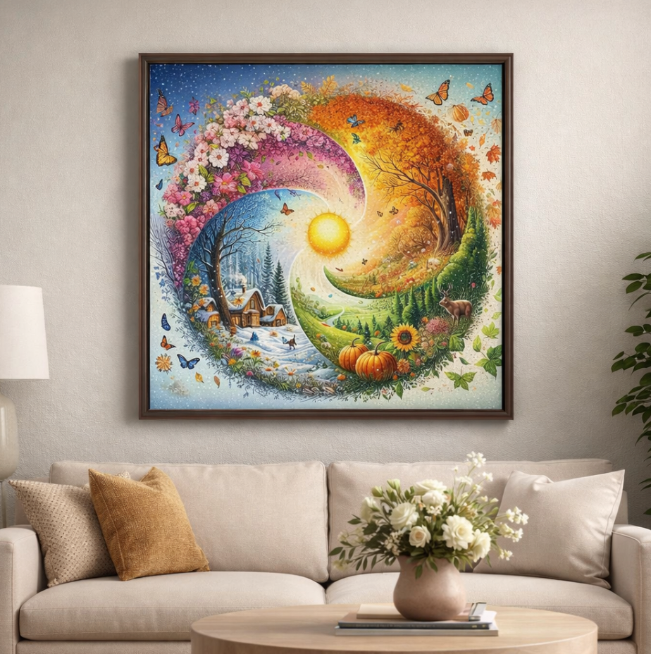 Deze betoverende Diamond Painting brengt de vier seizoenen samen in één prachtig yin-yang ontwerp. Van bloeiende lentebloesem en zonnige zomerdagen tot warme herfstkleuren en een knusse winter met besneeuwd huisje – elk detail straalt sfeer en balans uit. De heldere zon in het midden verbindt alles tot een harmonieus geheel. Een kleurrijk en symbolisch kunstwerk dat het hele jaar door blijft schitteren aan je muur.