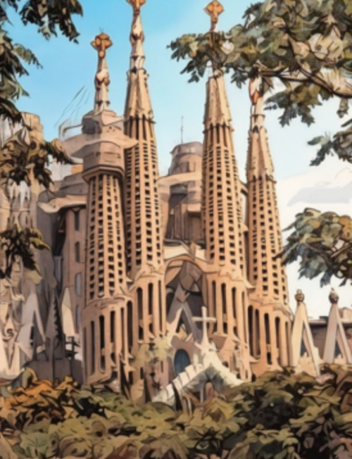 Deze schitterende afbeelding toont de iconische Sagrada Familia in Barcelona, majestueus oprijzend tegen een heldere blauwe lucht 🏰🌤️. De indrukwekkende torens, ontworpen door de beroemde architect Gaudí, zijn gedetailleerd weergegeven in warme aardetinten met verfijnde accenten. Omringd door weelderige groene bomen 🌳 en zonlicht dat de façade zachtjes verlicht, ademt dit tafereel een gevoel van bewondering en tijdloze schoonheid uit.